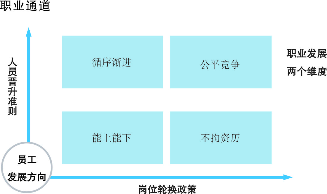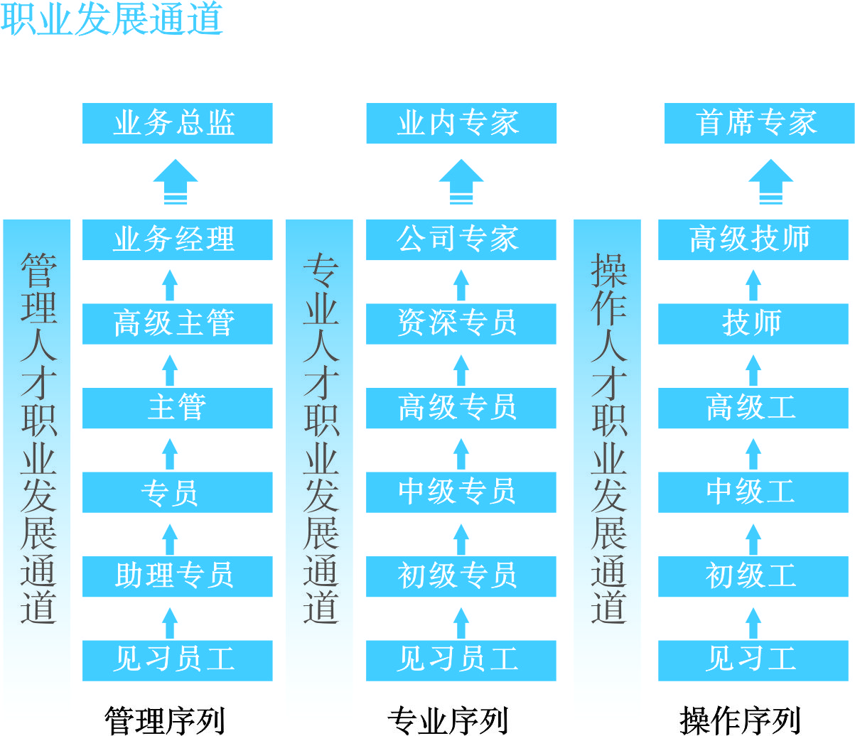 公司為員工提供多條職業(yè)發(fā)展通道,總體上劃分為管理、專業(yè)和操作三個(gè)序列。