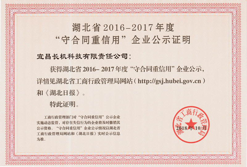 公司獲“湖北省2016-2017年度‘守合同重信用’企業(yè)”榮譽(yù)