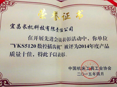 4月20日中國國際機床展覽會上,公司YKS5120數(shù)控插齒機獲中國機床工具工業(yè)協(xié)會授予的“2014年度產(chǎn)品質(zhì)量十佳”榮譽。