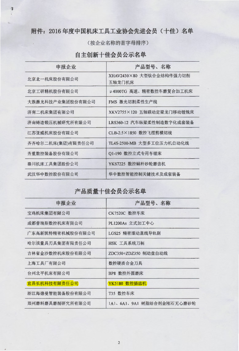 公司獲2016年度中國(guó)機(jī)床工具工業(yè)協(xié)會(huì)先進(jìn)會(huì)員(十佳)榮譽(yù)