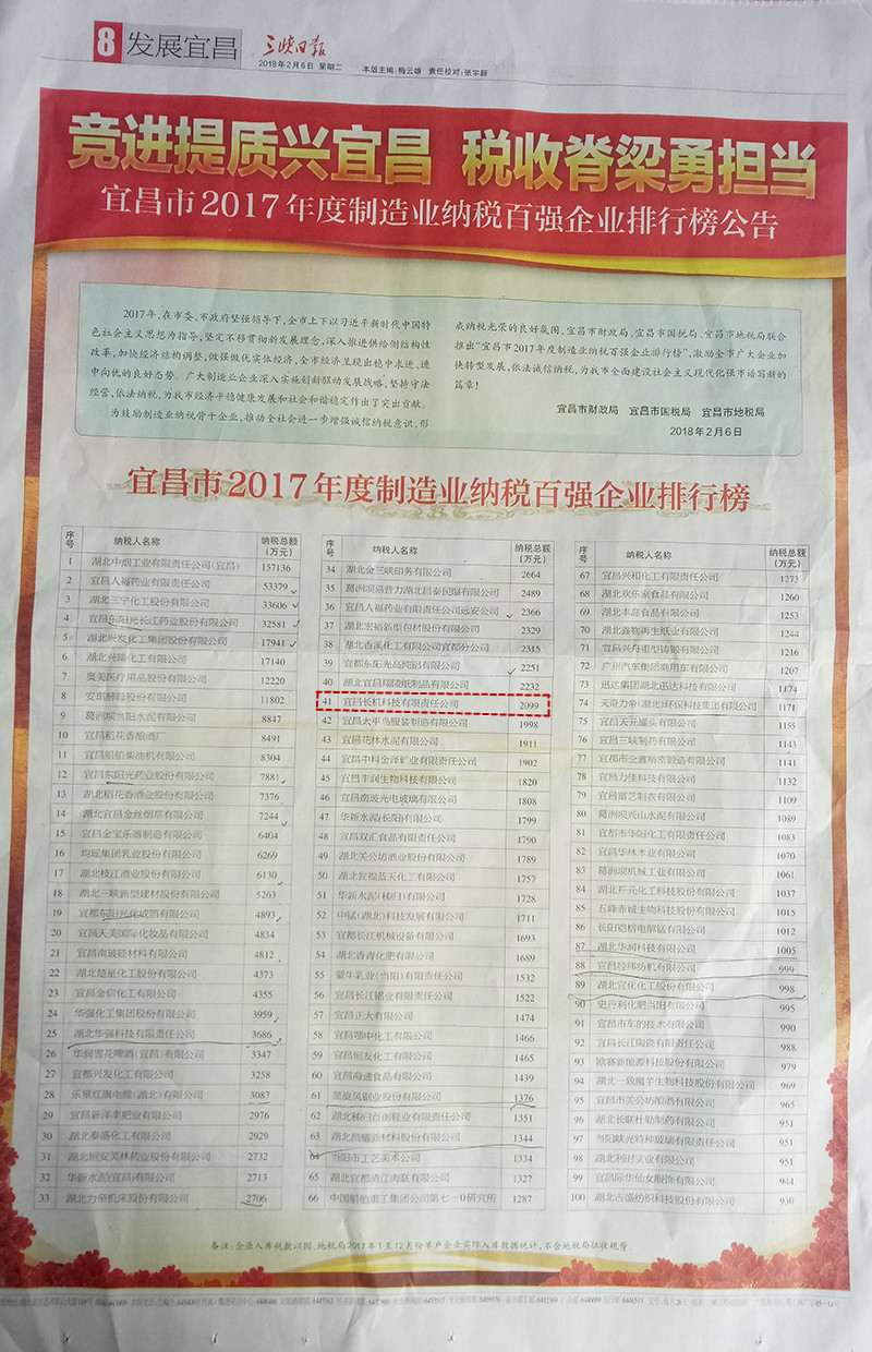 宜昌長(zhǎng)機(jī)科技上榜“宜昌市2017年度制造業(yè)納稅百強(qiáng)企業(yè)”